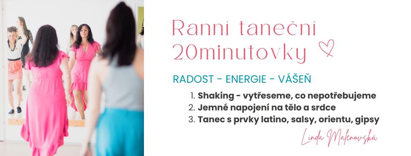 Ahojky Lindi, za mě mohu taneční dvacetiminutovky jen doporučit. Celé tančení je nesmírně citlivě poskládané rychlé rytmy, střídají pomalejší, nebo ještě rychlejší 😉 Mě nejvíce lahodilo napojení se na své srdce, cítila jsem vždy velkou úlevu a pohodičku v této oblasti. Linda vždy svou vášnivou energií povzbudí a naladí tak na velmi příjemné frekvence bytí. Tanec i napojení se na sebe jsem si užila. Moc děkuji za tento nápad.