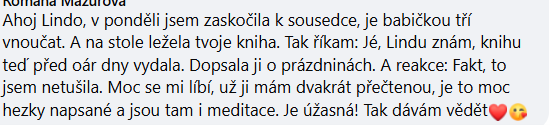 Ta tvoja kniha je proste neuveritelne presne rozpravajuca myšlienky mojho srdca a citenia a je to doslova balzam na dušu pre mňa." Katarína Tekáčová, psycholožka a průvodkyně emocionálním prožíváním www.katarinatekacova.sk